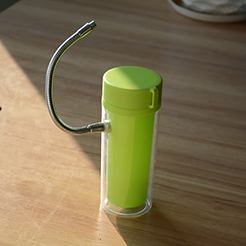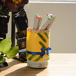 该作品是双向使用水杯,灵感来源于杯子的形状和笔筒类似,书桌上摆两个太占空间了